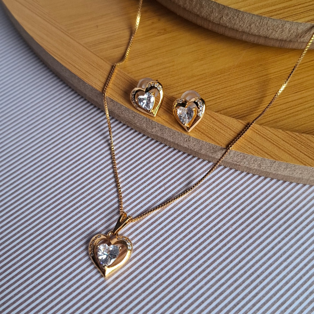 Conjunto Colar e Brinco Coração Cristal 45cm Folheado a Ouro 18K - OURO