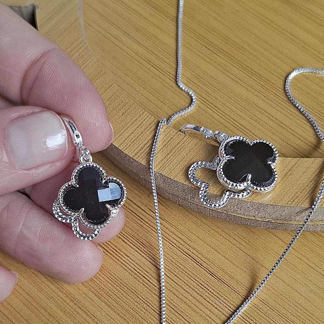 Brinco Argola Click Trevo Preto Folheado a Prata - PRATA