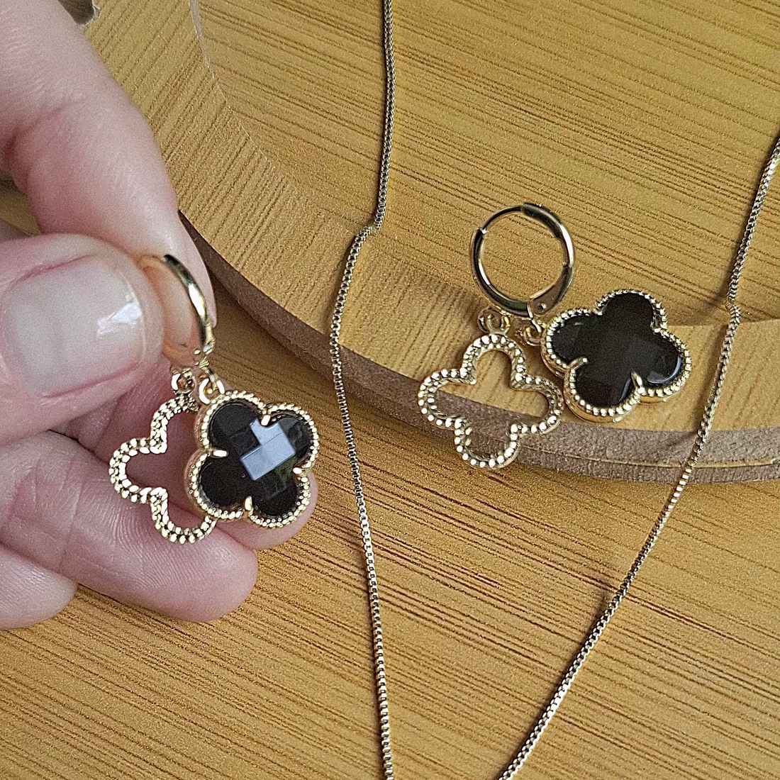Brinco Argola Click Trevo Preto Folheado a Ouro 18K - OURO