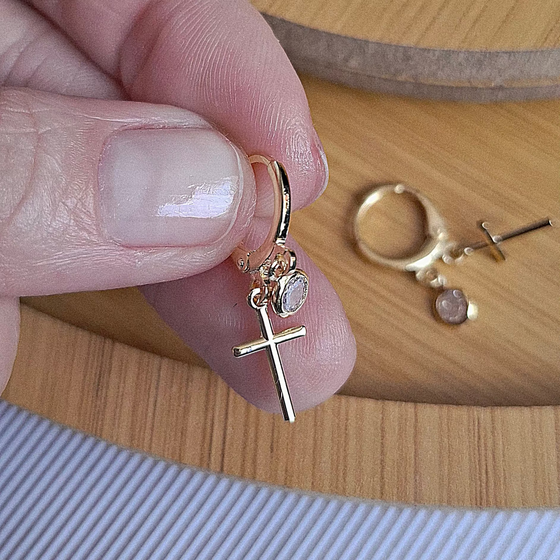 Brinco Argola Click Cruz e Cristal Folheado a Ouro 18K - OURO