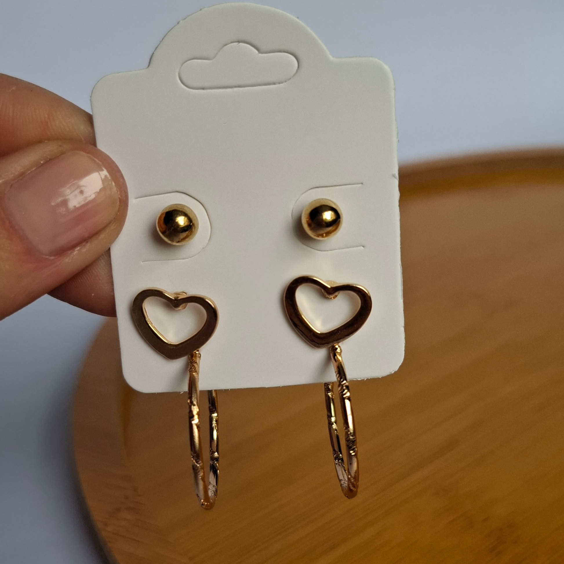 Trio de Brincos Coração Vazado com Argola Trabalhada Folheado a Ouro 18K - OURO