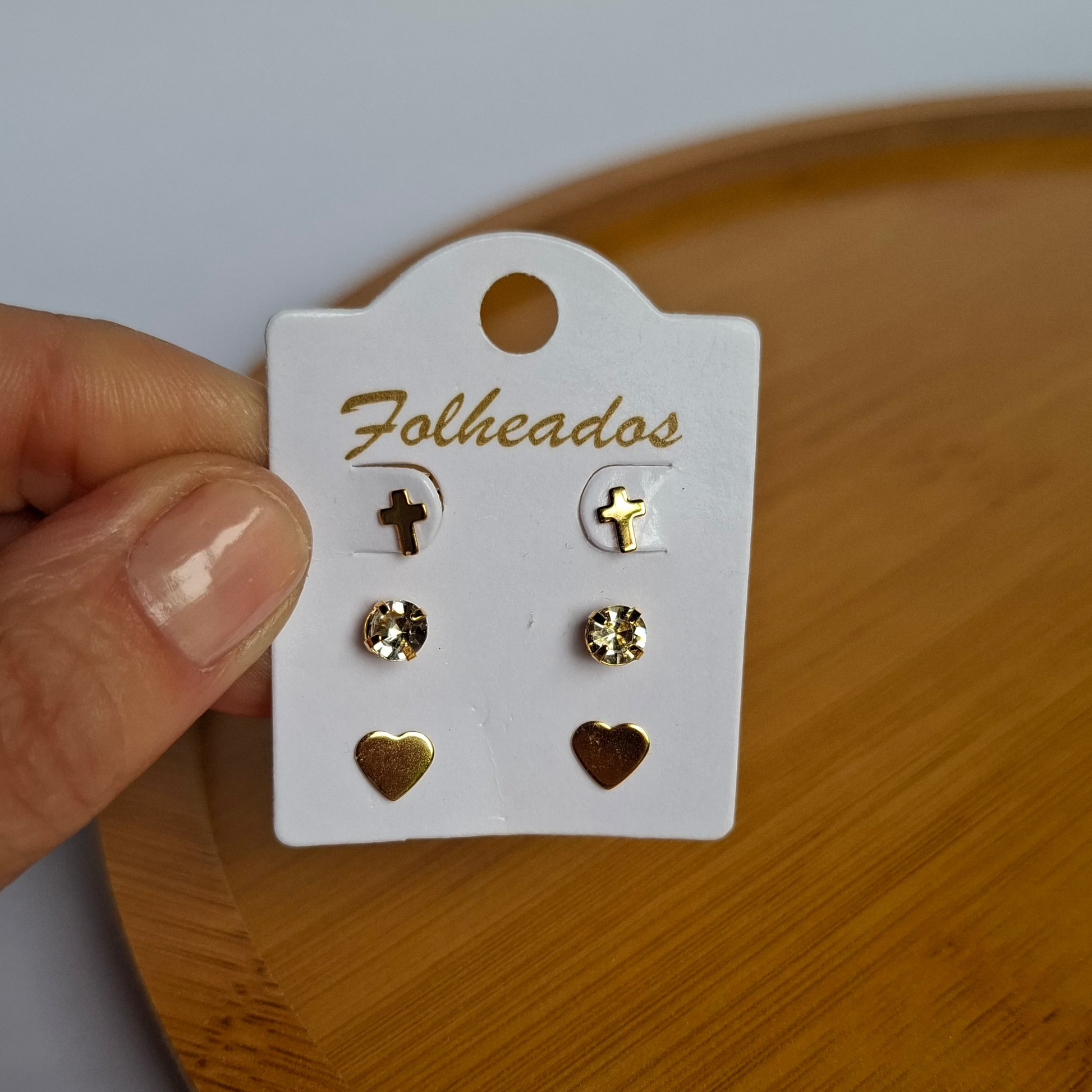 Trio de Brincos Cruz Folheado a Ouro 18K - OURO