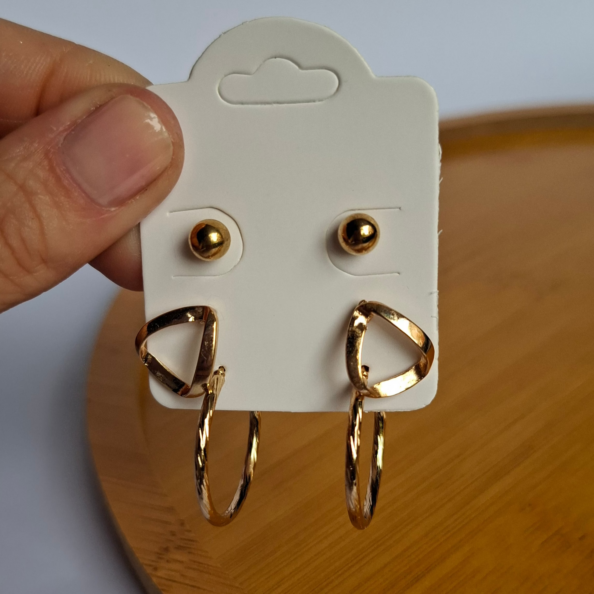 Trio de Brincos Triângulo Vazado com Argola Trabalhada Folheado a Ouro 18K - OURO